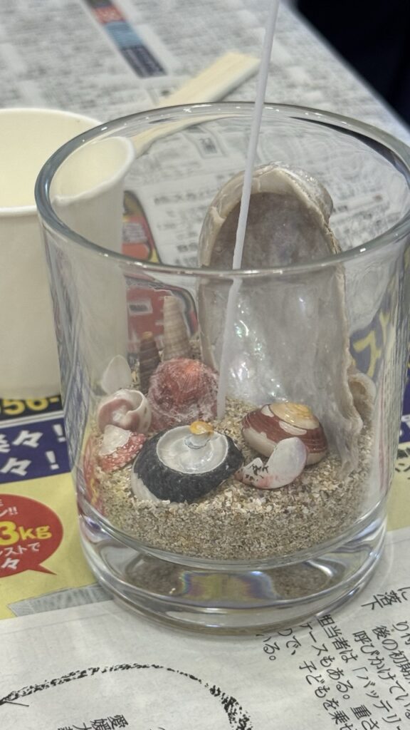 先日大浜海水浴場で壱岐高生が貝殻と砂を採掘した物をガラス容器に入れカラフルなゼリーロウを流し込みそれぞれ個性溢れる壱岐の海を思い出せそうな、素敵なキャンドルが出来上がりました。